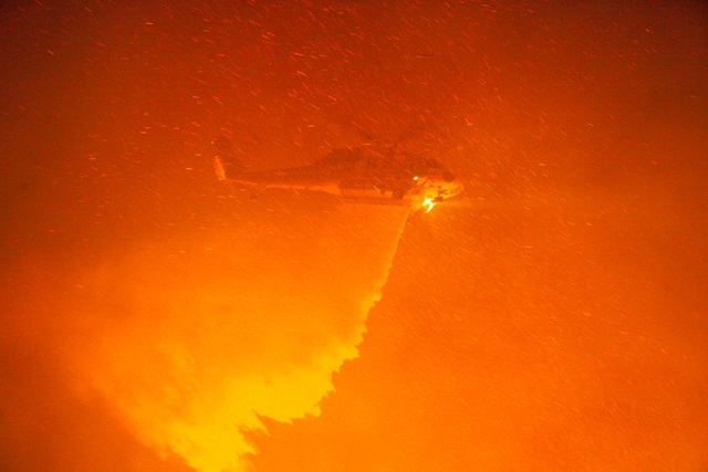 Night flying helicopter from LA County makes a drop onto homes threatened in the Northridge Rodd area.