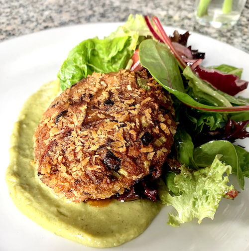 What truly sets the dish off are the zippy Ethiopian spices worked in the mix that get a bit of a heat accelerant from a spicy avocado puree underneath. This is not a dish for heat-wimps: You will feel a definite slow-burn as you consume the croquette. The simple greens, tomato, and red onion salad, in its classic vinaigrette, makes for a good foil. — George Yatchisin
