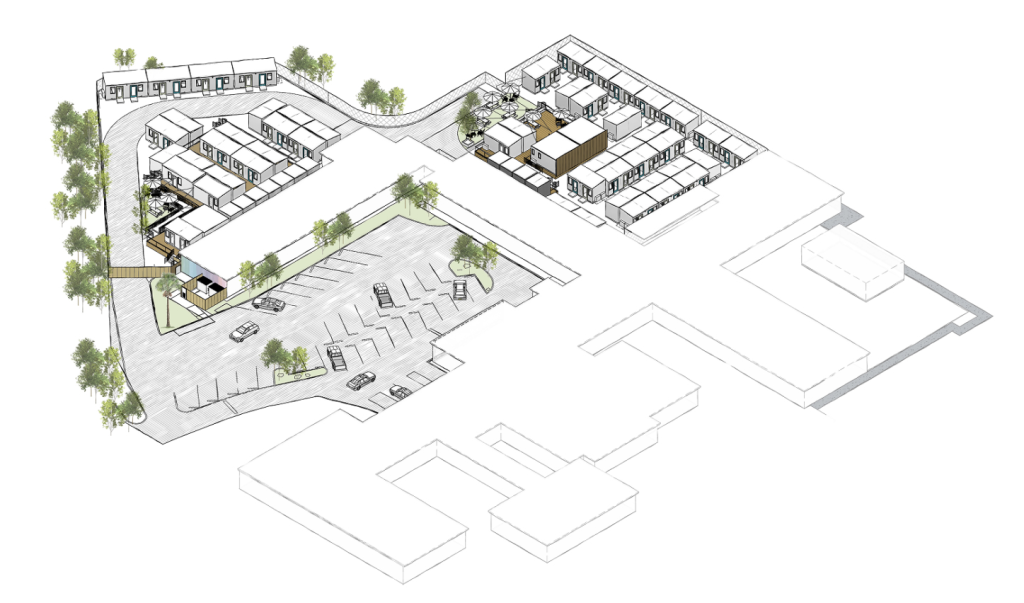 The occasion was a ground-breaking ceremony for a new tiny-home village designed to provide transitional housing for 80 people now dwelling in the homeless encampments long scattered throughout the hillsides above the site. When built, the new village — dubbed La Posada (meaning “shelter” or “inn” in Spanish) — will not only provide a roof for people who have lived without for many years, but each resident will have their own 8-foot-by-8-foot cabin, each with heating, lighting, air conditioning, Wi-Fi, a bed, a desk, a window, and doors that can be opened, closed, and locked by the occupants as they see fit.