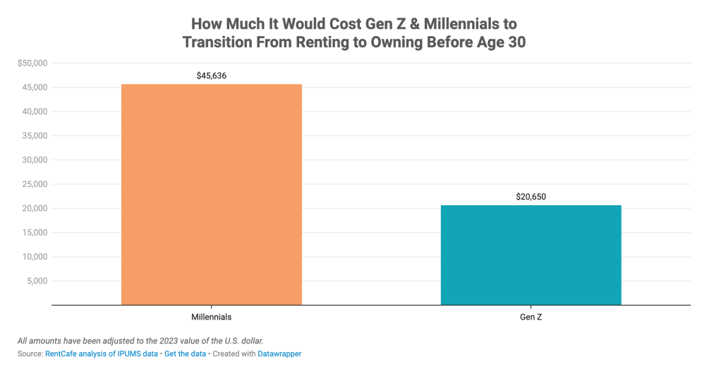 But luckily for Gen Z, their age group’s higher average income means they are narrowing the gap between renting and homeownership. In Santa Barbara, millennials would spend an additional $91,000 as homeowners compared to renters, while Gen Z homeowners would be paying $64,000 more than renters.