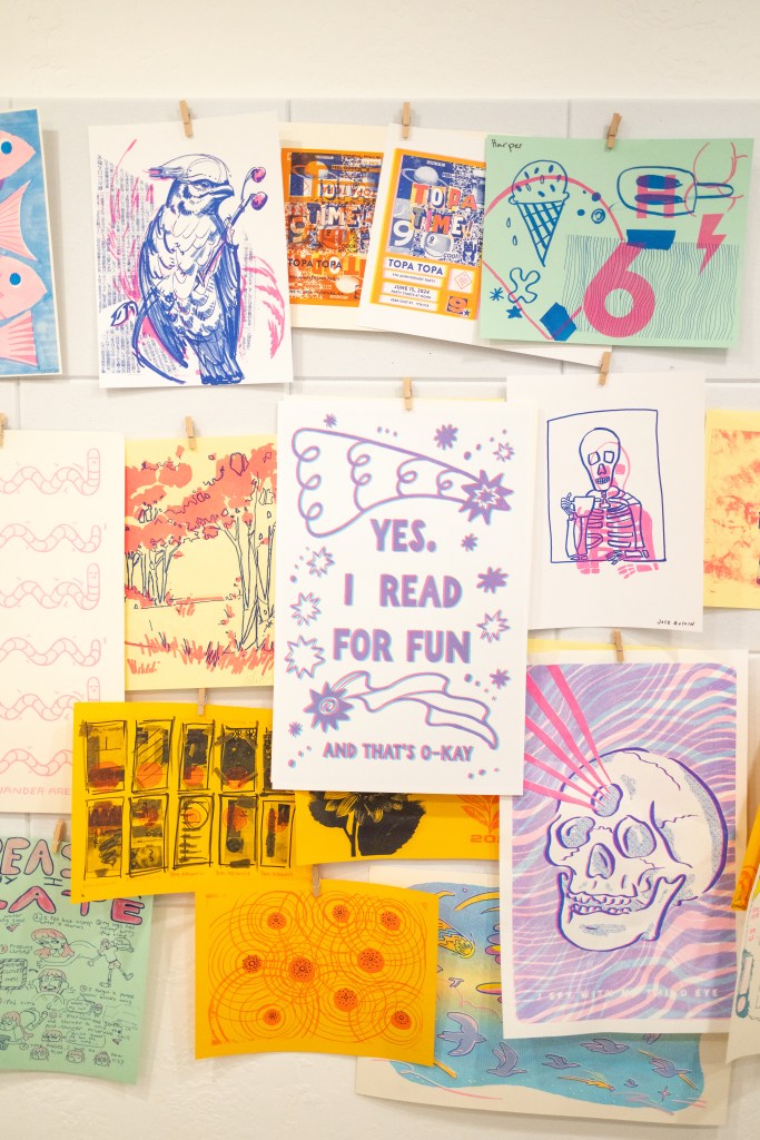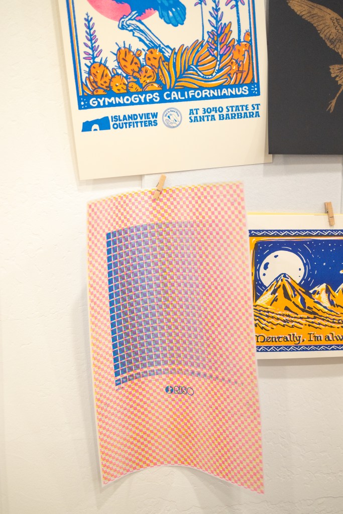 She continued, “It was just so inspiring to see the whole community gathered together to sell and appreciate paper prints, especially like paper print media and small publishing, analog print. … It’s a field that’s kind of, you know, not in its heyday, so it’s great to be able to see the community is still alive, and there’s still a lot of cool things. So, James really got the ball rolling, and we started organizing this. And of course, Alex Lukas [Associate Professor of Print and Publication] at UCSB also has a Riso program there, and he got involved right away as well. And then we brought Madi Manson [Loud Flower Art Co.] and Garrett Gerstenberger [High Desert Print Co.], who are both silk-screen printers, and then we decided to throw this event.”