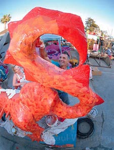 “It’s good to start the day off with a phallic discussion,” said Morrison, a compact, muscular man sporting a faux-hawk above a radar-yellow T-shirt, yellower wraparound safety glasses, and jeans shorts. “You know they all started out as phalluses, squirting the water out,” he said, referring to the great fountains of the world, which this float is trying to represent. “Then people changed them into other things like artichokes-like the fountain down at [Chase] Palm Park,” he laughed.