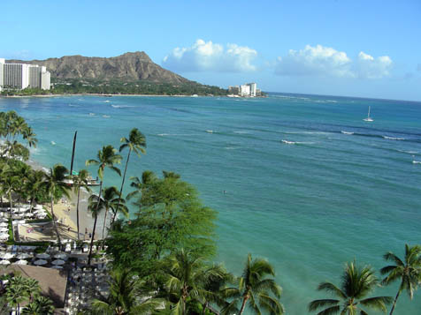 Back in Waikiki, we had a choice of either fine dining or beer and fresh fish at the loud, party-central Duke’s Canoe Club. It’s a spot for listening to slack key guitar music, chatting up folks at the next bar stool, and watching the sunset. But it was crowded and loud, so we found an oasis of peace upstairs at the Hula Grill, with its view through the palms of the peaceful Pacific.