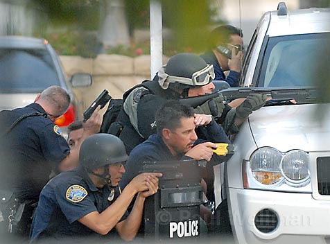 Meanwhile, inside the building, customers and Ralphs employees were led to the back of the supermarket, where they were released and told to wait across the street. Store managers secured the doors, while police cordoned off the parking lot and evacuated the MTD Transit Center, blocking off traffic on both De La Vina and Chapala Streets between Carrillo and Figueroa.