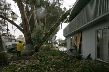 Howling winds and pouring rain last night brought down a few trees on UC Santa Barbara’s campus. John Cook, the Associate Director of Facilities, said that two small trees were lost at the east gate of campus and near lot five, and that a large blue gum eucalyptus tree also fell on the Western edge of campus. Unfortunately, it fell onto the roof of the apartment building at 6501 Sabado Tarde Road, crushing the eaves over the porch. Cook said that since the tree is on university property, they are paying for the tree’s removal and repairs to the apartment building. “It’s just minor damage to the roof,” he said. “We’ll put a tarp on it over night and fix it in the morning.”