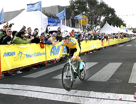 Fabian Cancellara, who was only 13 seconds behind Leipheimer at the start of the day, dropped back to fourth place, 1:18 behind. Cancellara won the opening prologue and is the reigning world time trial champion, but he might have been feeling the effects of Thursday’s stage from Seaside to San Luis Obispo 135 miles and over seven hours of slogging through drenching rain and daunting winds.