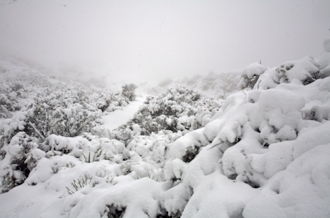 “It was like a one-two-three punch,” Paul Cronshaw, a local school teacher and leader of the Lite Packers who are checking out conditions in the deepest reaches of the wilderness areas explained to me. “After the first rains, many of the drainages started to get choked up with silt and debris. After the second set of storms, many of the trails became almost impassable due to the loose soil sliding down the hill and the gullies that were starting to form. Several of us were working our way down to Santa Cruz Guard Station from the top of Little Pine to see what conditions were like down there. We got by a huge oak that was laying across the trail, scrambled down an eight-foot deep gully not too far beyond that but when we got to another section that had 4-5 gullies one after the other, we knew it was time to head back up the trail. Then, not too long after that we had the snow storms. Oak limbs were down everywhere. Chaparral brush was down on the trail. It was really tough to get anywhere.”