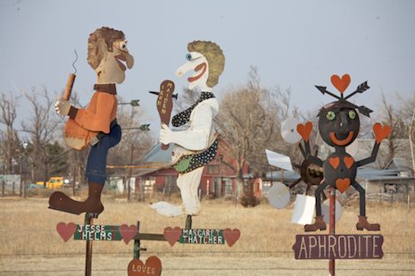 Later I find out this is the art of one M.T. Liggett, born into a sharecropping family in tiny Mullinville, Kansas in the 1930’s. After a career in the military he returned to his birthplace, settled in on the farm and in 1989 began creating the unique sculptures that adorn the fence line along Highway 400. From what I can see, there’s no place on the political spectrum to define Liggett’s art: he appears to be an equal opportunity offender.