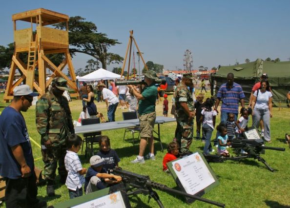 Seabee Days are held every year in an effort to reach out to the public and show them what the Naval Construction Battalions do, said Terri Reid, the base public affairs officer. “It’s an opportunity for the public to come and learn about the Navy and learn about the things we do here,” she said. “Naval Base Ventura County isn’t normally open to the public like this.” This weekend, the main parade deck was filled with displays of some of the equipment used by the units in the field. Rows of olive-drab dump trucks, cranes, and other equipment lined one end of the square, while examples of what they build-bridges, security towers, medical buildings, and the like-were clustered at another. Some of the displays were interactive, such as a large tank of water where people could watch UCT sailors in full camouflage battle dress swimming in their diving gear. Above all the proceedings was suspended an American flag-supported from either end by a large crane. A parade Saturday morning was complete with 500 uniformed Seabees marching down Channel Islands Boulevard, and sailors in humvees bringing up the rear, firing blanks from vehicle-mounted M2 and M240G machine guns. A car show with everything from Fiats to Fords rounded out the scene, with numerous vendors offering snacks and trinkets to passersby.