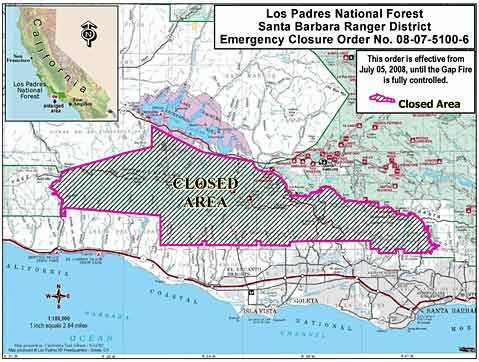 All national forest lands south of Highway 154 and East Camino Cielo that east of Gibraltar Road and west of Refugio Road, are now closed to the public until the Gap Fire is suppressed, Los Padres National Forest officials announced Saturday afternoon, July 5, just before 4 p.m. The closure does not include the roads themselves, nor does it apply to private land.