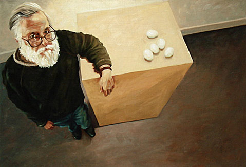 The small pictures on copper include a powerful, somewhat brooding “Auto Portrait” of the artist wearing a black-and-white scarf decorated with a print of skulls. This detail adds an art historical dimension to the treatment, which is worked heavily in the manner of Dutch masters De Kooning and Rembrandt. The idea that the traditional memento mori has become an accessory, something the artist can wear and remove as casually as a scarf, puts the memento tradition in a startlingly contemporary and ironic new perspective.