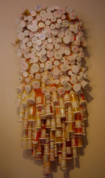 The pinnacle of the show was Rocky Stroup’s self-portrait wall sculpture, “Borrowed Time (13 Years of Pill Poppin’)” which loomed at the edge of the gallery space like an unusual fellow with a story to tell. “I had open heart surgery over 13 years ago,” the artist explained. “That piece is made with more than 1,000 pill bottles I collected.” The plastic bottles jutted from the wall like a round, clustering formation of barnacles.