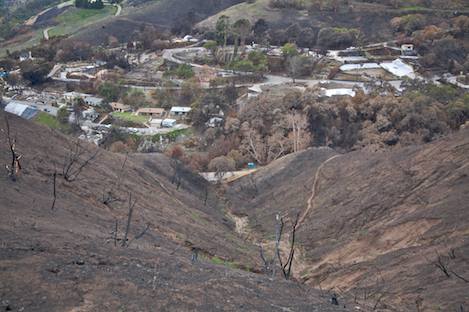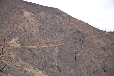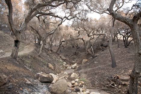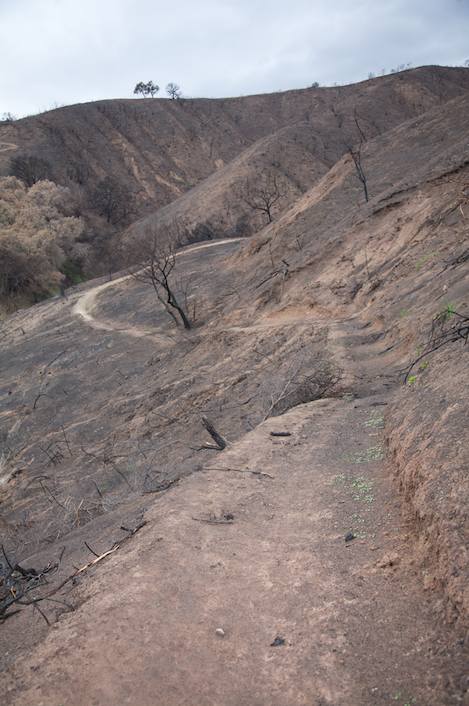 Several of the westside trails lead up to Mountain Drive, but if you stay in the park, eventually others will take you in a counterclockwise direction back to the dirt road and the east end of the park. Here, the hills are much steeper and though these had been dominated by sages and chaparral-type vegetation prior to the fire, not much is left now-with the exception of a picnic table and hitching post at the high point in the park. Post-fire, the vegetation has been reduced to moonscape: There is none anywhere, just bare soil.