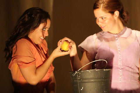 Lieberman, a Westmont senior and a scenic artist, convincingly portrays Aideth’s melancholy determination to set herself free. Initially playing a repressed woman whose plain clothing is chastised by the spunky Aunt Dolores Simon, Lieberman expresses anger and release in the climactic scene of Aideth’s internal change. Sarah Halford, also a Westmont theater arts senior, delivers another successful role as Fay, the entitled wife of the wealthy peach cannery owner. In one of the less surreal scenes in the play, Aideth and Fay connect in an unadorned moment of truth (aided by a few drinks) as two women with similar struggles, regardless of their class or culture.