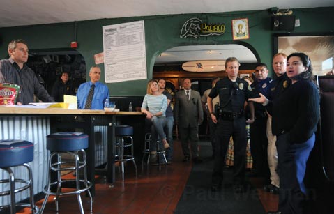 The standing-room-only crowd at The Neighborhood bar on Montecito Street also included City Council members Dale Francesco and Iya Falcone, the latter of whom is running for mayor. Three Santa Barbara city police officers attended too.