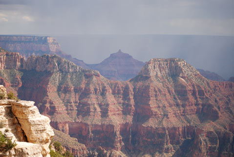 The dark September sky grumbled all afternoon, but from our viewpoint at the Grand Canyon Lodge, a flamboyant sun turned the chameleon canyon into rich, ever-changing shades of red, purple, and sandy cream. Out there somewhere, torrents of water poured down from above, the same force that helped shaped the gorge. Six thousand feet below us, out of sight, rolled the mighty Colorado River.
