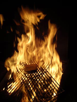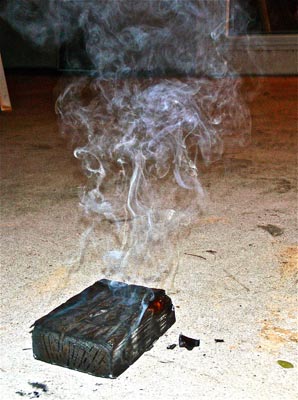 Suspicious, I located a barbecue and tried to burn some TimberSIL myself. I carefully placed two small samples about three inches above the simmering charcoals that would soon grill some burgers. At upward of approximately 600° F, the wood almost immediately began to scorch. It was not until the wood was placed in immediate contact with the sweltering, orange-black coals, where the temperature was doubly hot, that it really picked up a flame. I removed one piece after 10 minutes, and, upon placement in the damp grass, the relatively unchanged but blackened sample merely smoked. The other piece broke down slowly but definitely over the next 10 minutes among the coals; it was the only thing in the barbecue that was clearly flaming. After 20 minutes total, the wood did not hold a flame but fell into many disintegrated, thoroughly burned tiny pieces of black charcoal-like material-much weaker and deader than I had thought possible.