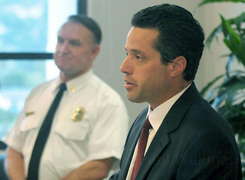 Santa Barbara Senior Deputy District Attorney Jerry Lulejian (center) holds a press conference relating to the two arrests made in the Jesusita Fire. Also in attendance County Fire Chief Michael Dyer, County Fire PIO Capt. David Sadecki, and Acting District Attorney Joshua E. Lynn.