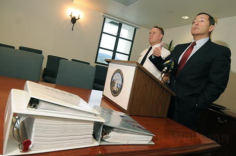 L to R Santa Barbara Senior Deputy District Attorney Jerry Lulejian (left) leaves the Jesusita Fire press conference with a bundle of paperwork related to the case, with former Acting District Attorney Joshua E. Lynn and County Fire PIO Capt. David Sadecki