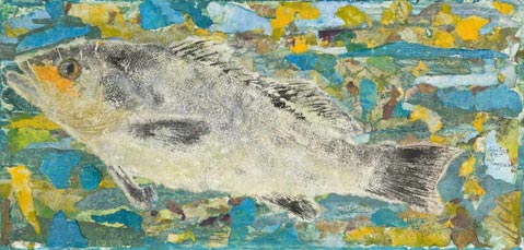 These are more than artistic representations; they’re actually prints made in one of two ways: either by applying color to the fish and pressing fabric or paper against it, or by laying a cloth against the body of the fish and applying paint to the thin material using the body as a guide. Craig Rudholm has been making fish prints for more than a decade, and he often uses handmade paper. His techniques are influenced by gyotaku—the Japanese tradition of printmaking used to record fishermen’s catches—but Rudholm goes far beyond cataloguing. In these works, bass, rockfish, and cod become characters in their own enigmatic, watery dramas.