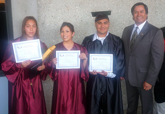 Bill Cirone, County Superintendent of Schools, presented 18 students with diplomas at the El Puente Community High School Graduation ceremony held this week. Rotary Club of Santa Barbara Sunrise member David Velarde, presented three of the students: Jorge Rios, Juana Torres and Hitxza Uriostegui with $500.00 Education Assistance Grants. Two of the students, Juana and Hitxza had been recipients of the Sunrise Student of the Month award.