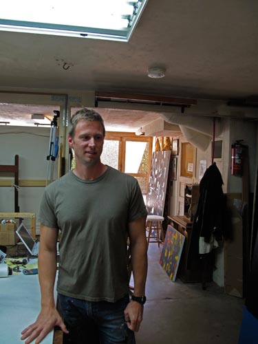 “The fires last year were very disturbing to me. For my in-laws, who have lived here, they were not such a big deal, but I had to process it emotionally. During one of the fires, my wife was due to have a baby, and we were planning a home birth, and we couldn’t even open the window. So I took all that and I put it into these paintings because for me the optimism at the end of a difficult process is what I am always aiming at when I paint. I get immersed in the pain and the darkness and despair, but then I try to come out on the other side. The restructuring of this painting, for instance, has coincided with the rebuilding of the homes that were destroyed. And over here, what I have tried to capture is the way that the natural world regenerates, so I have been observing what’s happening in the natural world and then trying to bring that feeling into the studio. Now I have a group of ten paintings that I believe reflect not only my personal journey but also the process that we’ve gone through as a community as a result of these events, the Jesusita and the Tea fires.”
