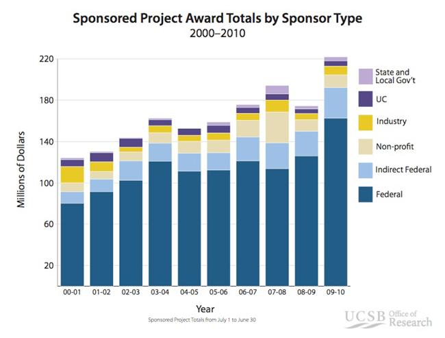 UC Santa Barbara had a record-breaking 2009-10 fiscal year when it came to research funding, school officials announced Thursday. A total of $222 million was received from external sources — including federal and state agencies, corporations, and nonprofits — which is a 28 percent jump over last year.