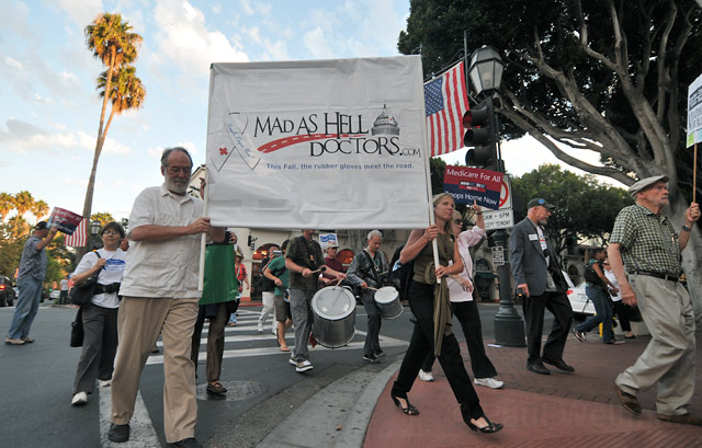 A group of 50 marchers teaming with Mad as Hell Doctors protest on State Street Sept. 30, 2010
