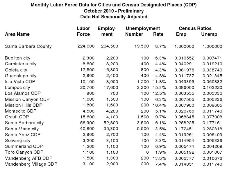 For October 2010, the EDD continued to show double-digit unemployment rates for the County’s Statistical Census Areas at Vandenberg Air Force Base at 13.8 percent (14.3 percent in September); Los Alamos at 12.5 percent (13.0 percent in September); Isla Vista at 11.8 percent (12.2 percent for September); and Mission Hills at 10.4 percent (10.8 percent in September) and while Orcutt dropped to 9.7 percent, down from 10.1 percent.