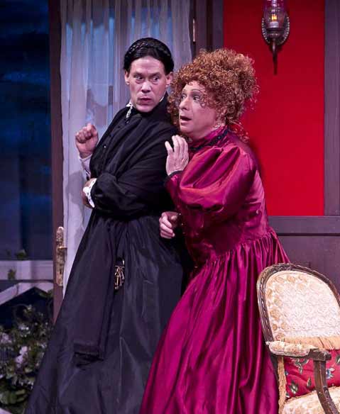 In the clever and wickedly entertaining world according to Charles Ludlam, the playwright responsible for The Mystery of Irma Vep, this observation comes as close as one gets to a serious message. As staged by director Jenny Sullivan and marvelously played by the two actors, Torcellini and Fuqua, Irma Vep brings topsy-turvy, cliché-saturated make-believe roaring to life through dozens of lightning-fast costume changes, double entendres, zany gestures, and over-the-top facial expressions. Yet at the core of this delightful show, for all its goofy props and hackneyed situations, there’s a beating heart and a yearning soul—and they belong to a man in a dress. For Ludlam, and for those like Fuqua and Torcellini, who dare follow in his dainty footsteps, the art of drag is much more than a titillating stunt designed to elicit laughter—which is not to say there’s nothing funny about it—it’s also a door opening onto the entire history of film and theater, only remade as an imaginary playground for some delirious scrambling about.