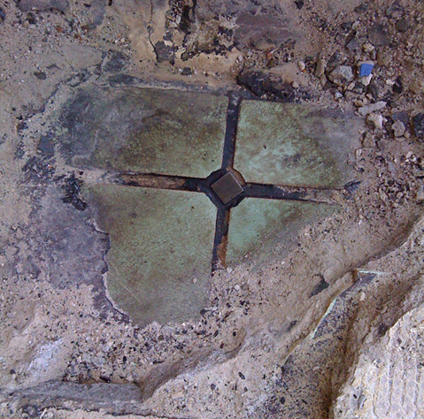 As crews worked to remove the tile water feature at the Santa Barbara Courthouse, Spirit of the Ocean Fountain project, a bronze in-set was discovered. It is believed by the Fountain Project Team to be the signature mark of the original tile setter of 1928. This 1 inch square bronze “tile” will be reset in the new replicated tile in the same location. Project researchers and historians will set out to determine, if possible, who the tile setter was that set his mark on his completed work of 1928.
