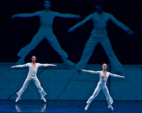 It’s natural to wonder at first whether anything is going to happen here. Dancers chassé across the stage in pairs, moving left to right, their footwork changing almost imperceptibly as their patterns grow more complex. Like their filmed counterparts, they wear white. Occasionally, the light shifts from yellow to blue or red. Sometimes the film hovers above the dancers’ heads; sometimes it shares the same register so that live and recorded performers appear to share one stage.