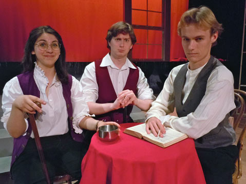 The young men in the cast were equally successful, particularly Toby Tropper in the key role of John Adams. Tropper delivered his character’s arguments with verve, developed the role through physicality, and conveyed the affection between John and Abigail Adams (Alyssa Grant) with real tenderness. Grant’s voice was also a great asset to the production and added considerable power to several scenes, particularly the poignant “Compliments” in Act Two. Ray Cothern had the perfect distinguished but youthful glamour for his role as Thomas Jefferson, and Tad Murroughs brought just the right touch of antic energy to Jefferson’s fellow delegate from Virginia, Richard Henry Lee. The score of 1776 reflects a broad range of song styles, from the comic wordplay of “Lees of Old Virginia” and “But Mr. Adams” to the plaintive and heroic strains of “Momma Look Sharp” and “Molasses to Rum.” As Roger Sherman, Cameron Platt traversed the gamut, contributing with wit and expert comic timing to “But Mr. Adams,” and then reappearing as Leather Apron in Act Two to sing the melancholy “Momma Look Sharp” with Nanda Douglas as the Courier. Mia Burridge as Edward Rutledge (the youngest signer of the Declaration of Independence) made “Molasses to Rum” her own, stopping the show with emotional fireworks and a great voice.