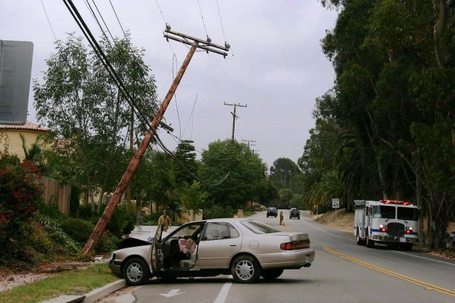 A car accident at 9:35 a.m. this morning knocked out power to dozens of Goleta homes. According to County Fire officials, a 75-year-old man lost control of his car on Modoc Road and Encore Drive and hit a power pole, shearing it off its base. The man was injured, though it’s not clear to what degree, and he was transported to Cottage Hospital by ambulance. Live power lines fell into the street following the collision; Southern California Edison personnel responded and quickly cut power to the area. Modoc Road was closed in both directions as emergency crews worked the scene. The cause of the accident is under investigation by the CHP.