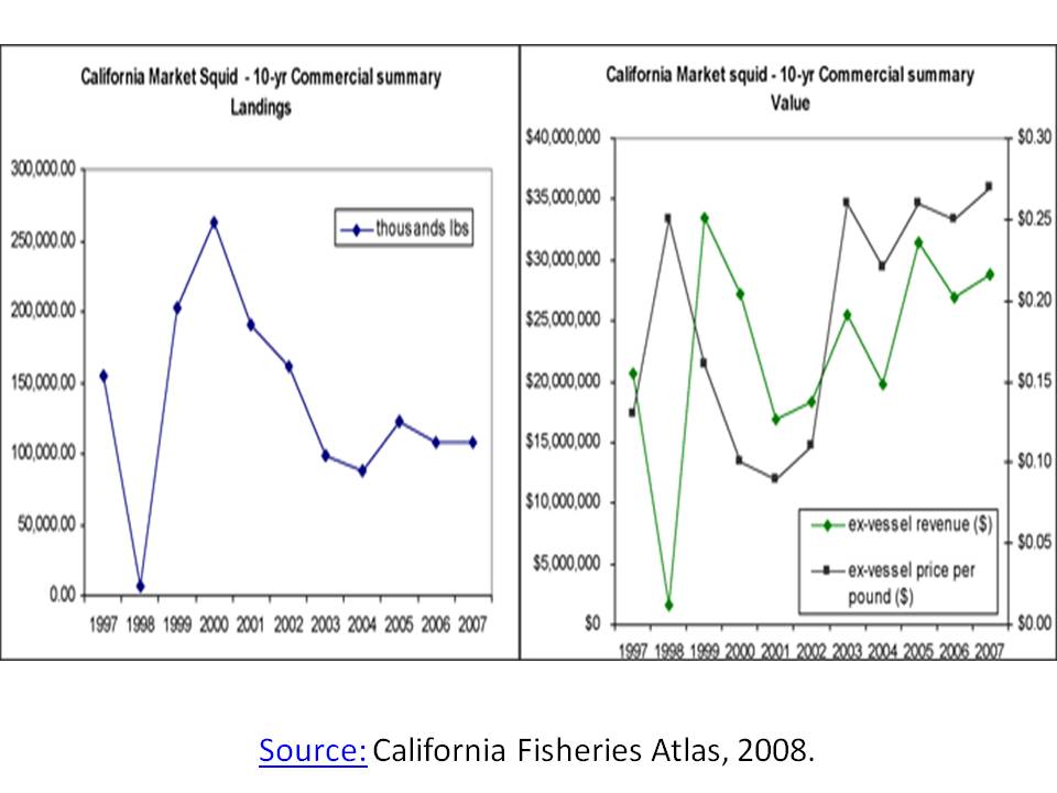 The fact is that higher volumes of lower valued species, such as squid, have replaced the big fish once caught from our marine area. Today, invertebrates account for more than half the value of total commercial landings in California. Ecologists refer to this process of shifting to lower value invertebrate species as “fishing down the food chain.” Higher-value fishes have been fished out and replaced by lower-value but higher-volume commercial activities.