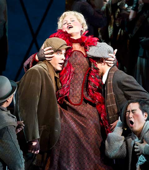 Each of the four acts of La bohème resembles a lyric poem, with seemingly discordant or opposing elements that coalesce into a single unified sense of deeper meaning. In Act One, the boisterous camaraderie of the garret crew of Marcello (Malcolm Mackenzie), Colline (Gabriel Vamvulescu), and Schaunard sets one tone when they run psychological circles around the landlord Benoit (Jesse Merlin) in order to avoid paying rent. But the intense vulnerability of Mimì, who enters immediately after the gang leaves and who bears the story’s most powerful symbol, the unlit candle, gets amplified by Rodolfo, who tricks her into sticking around and then pours out his heart in an outstanding aria. The yin and yang of these two elements — raucous irresponsibility and tender isolation — are what make the whole act work, and in this production they meshed seamlessly.