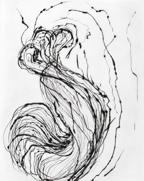 The Trace Drawing series represents Schoeff’s original contribution to the history of the print, as they exist by virtue of a sequence of procedures that, in this combination at least, are wholly the artist’s own and that result in a two-sided art object that resists easy assimilation into known categories of print or drawing. Schoeff draws on the exposed side of a sheet of paper while the inked plexiglass plate sits below her drawing surface, marking the far side of the sheet. Then, when the print is pulled, what’s underneath shows up as a negative of the image on top, as the pressure of the drawing on the surface evacuates lines of white from the print below. There are also all kinds of incidental effects due to the presence of air bubbles and dust. This side of the drawing is the trace, and it provides a ghostly reminder of the double life that any image leads in the age of mechanical reproduction.