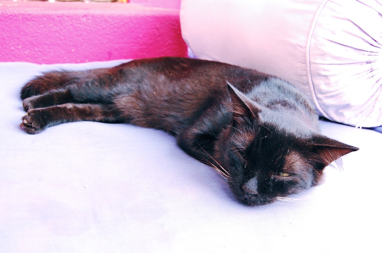 Satsanga, Goa, February 26, 2012 This Sunday afternoon I sat down to interview Jodi Boone, yoga teacher, fellow American, and lady of the house here at the Satsanga Retreat Center. Underneath bright pink bougainvillea we chatted about Satsanga, her yoga style, and her favorite spots in Goa. Part way through our conversation we were joined by Luciano, the big black cat that never has a shortage of laps to nap on.