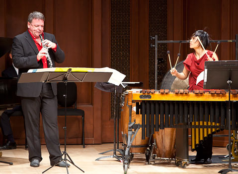 The centerpiece of the first half was Iannis Xenakis’ Dmaathen, a demanding duet for oboe and percussion. Oboist extraordinaire, Nicholas Daniel, drew upon curdling multiphonics and circular breathing to elicit atonal cries and calls, while Ji Hye Jung deftly worked a complex of gong, congas, marimba and bass drum that enclosed her on three sides. The raw climaxes of Dmaathen were wild in thunder and double-reed shriek. Toru Takemitsu’s Towards the Sea was, by contrast, a poem of silences in consonant tonality. This mellow pairing of alto flute and marimba contrasts wind and percussion, but also reveals surprisingly similar tubular resonances. Spence’s long tones were waves swelling out from inaudible nothingness. Pianist Adam Neiman was articulate throughout the Bennett pieces, the complex time rippling through his arms, terminating in sudden treble key grabs. The entire set of duets and solos was played like a series of movements, without intervening applause, entrances or exits. The four musicians remained visibly on stage throughout; which means there were always at least two, and sometimes three people onstage simply listening.