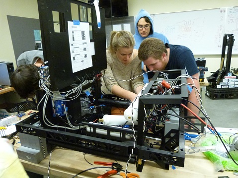 Once they enter the arena this Thursday, the D’Penguineers will spend the entire day in the pit fine-tuning their robot and ensuring that it is competition-ready. The pit, a 10-by-10 foot workspace allotted to each team, will be the D’Penguineers’ headquarters during the 3-day event. Here, the students and their mentors will finish building up mechanisms, mounting final pieces of the frame, routing wires, and debugging code. FIRST Robotics teams are permitted to bring up to thirty pounds of fabricated parts and unlimited off-the-shelf components to make any necessary additions or adjustments to their assembled robot, and Team 1717 is sure to bring in as many spare parts as possible. The D’Penguineers will have to work at a brisk pace in a hectic environment to guarantee a fully functional robot before the eight-hour time limit is up. According to Shen Meinhold, these eight hours will “be pretty stressful, but eventually we will prevail because of all of our hard work and dedication. There’s a lot of work to do, but we’re up to the challenge.” Once the finishing touches are complete, each team’s robot will undergo a thorough inspection, making sure that all of the standards set forth by FIRST Robotics are fulfilled.