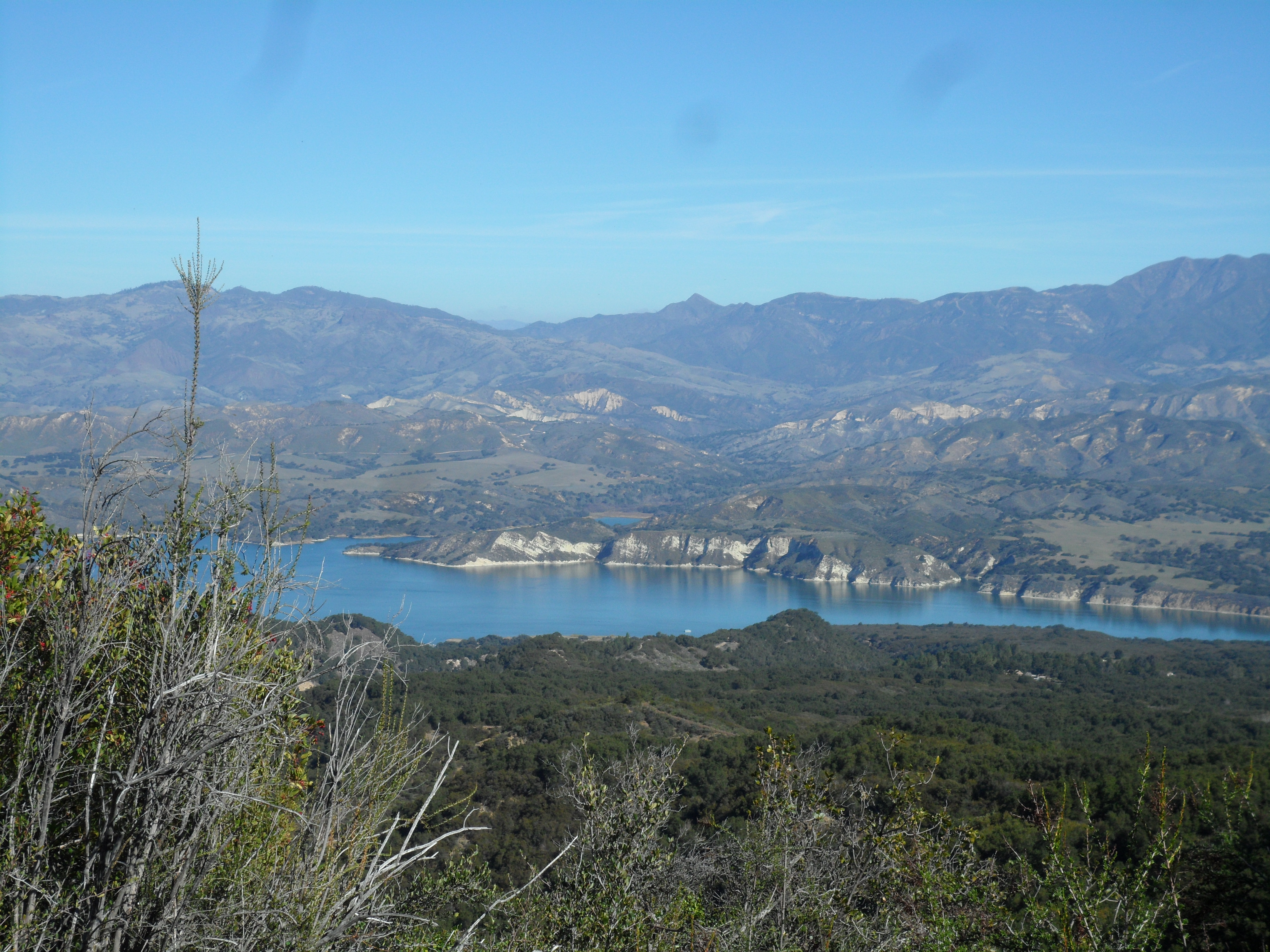 From half-way up, on the long languid switchbacks of the Tequepis Trail, you can enjoy many fantastic views back toward Lake Cachuma and Bradbury Dam, views you never get from the Chumash Highway. Above the lake you win glorious vistas of the Santa Barbara backcountry: You can see Peachtree, Mt. San Rafael, and Big Pine Mountain (6750 feet).