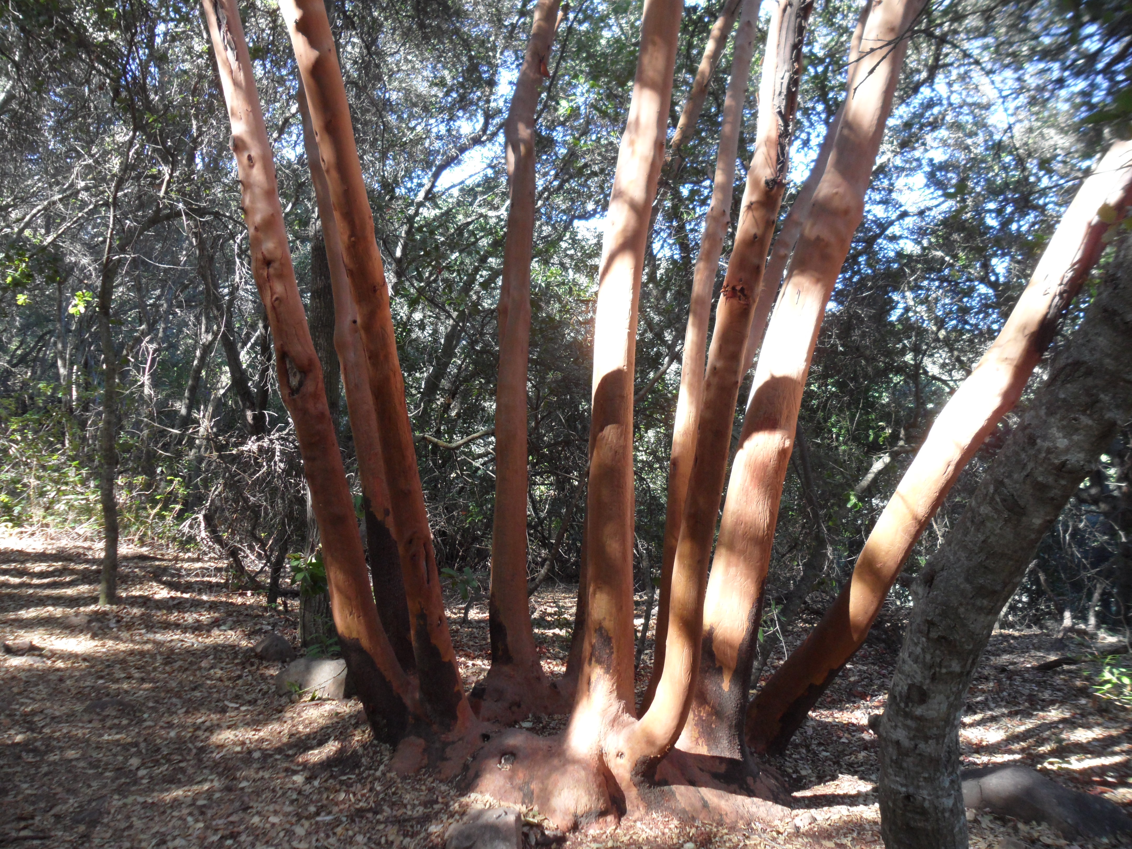 Approaching the crest you encounter more madrone trees (Arbutusmenziesii, commonly known as the Pacific Madrone). This type of arbutus tree, with beautiful golden bark, isn’t found south of Santa Barbara County, so we’re at the end of its range, which begins in British Columbia.