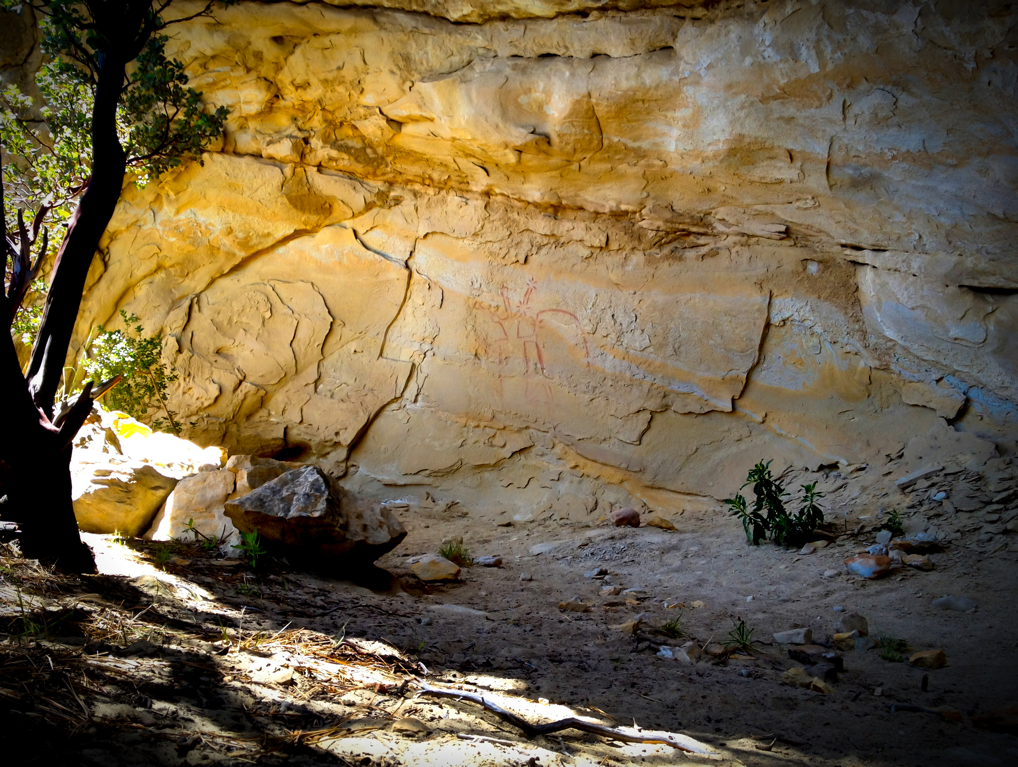 In an earlier career incarnation I worked as a Mediterranean archaeologist. Ancient art and anthropology have remained lifelong interests. The Chumash people made fantastic art in their baskets as well as in sand and on cave walls. The area we are in has few known pictograph sites, but I’m aware of some, and I revealed one to my nephew Eric (I will not disclose the location). Fancifully, I call this one “the Red Shaman.” Native-American rock art amazes the awed onlooker, and it’s hard not to fall on your knees in the rock shelter and babble incoherent prayers. David S. Whitley’s A Guide to Rock Art Sites (2nd ed. 2001) is a solid introduction to sacred rock art in our region.