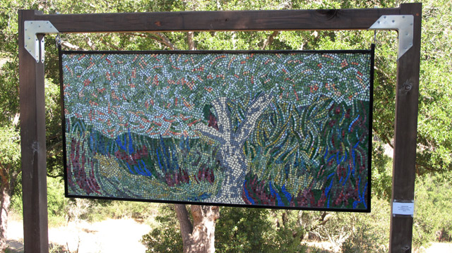 Crocetti will be on-site this Wednesday, August 8, beginning at 1 p.m. for an event that is open to the public in which she will unveil three additional pieces, including one that was conceived when she and her son were cycling between Santa Barbara and her home in Watsonville, California. The piece, called “Arroyo Hondo Arch Bridge,” distills the essence of Crocetti’s approach, which involves using art to invite the public into a dialogue with each other, with the artwork, and with their natural environment. During the August 8 event, Crocetti will be soliciting further input from visitors and inviting those present to participate in the planning and execution of one more final stained glass mosaic for the Botanic Garden.