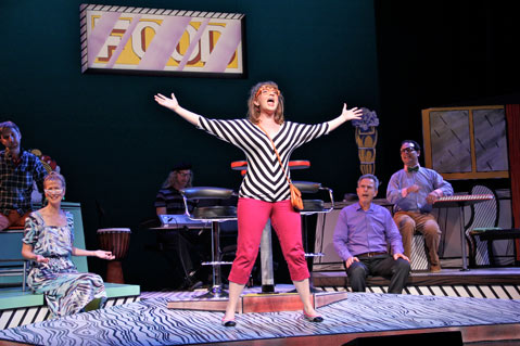 Thanks to a pop art–inspired set by Thomas S. Giamario that’s part bar, part diner, and part kitchen, there’s no need for scene changes. Everyone stays onstage, including musical director Douglas Clegg on keyboard. Each member of this cast of five plays at least three characters — a serious challenge given the lack of costume changes — and they pull it off admirably. Among the most successful and dramatic of these shifts is Scott’s metamorphosis from swaggering Bronx boy Chip to uptight nerd Eggbert.