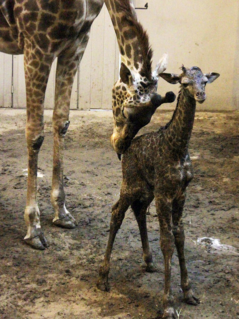 The new calf rose to his hooves after less than an hour, teetering at a healthy 6’3”. He underwent a routine medical exam on Friday afternoon to determine when he will be fit for exhibition, seems to be nursing normally, and is not expected to need any hand-rearing.