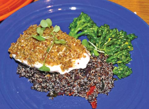 • Local wild Santa Barbara halibut baked with a whole grain mustard, pine nut, and Grana Padano crust, alongside an olive and sundried tomato quinoa pilaf and broccolini