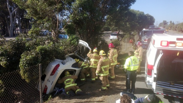 Santa Barbara County firefighters sawed through a chain link fence and thick vegetation to rescue two people trapped in a rollover accident this morning.