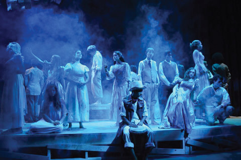 The Spoon River Project, which just concluded its run at Dos Pueblos High School, was a drama with music that was conceived and performed by students under the direction of Gioia Marchese. The show began outside the auditorium as a procession, with the white-faced students solemnly guiding the audience around the building and through the stage door to seats arranged in the round and onstage. Through an imaginative blend of folk songs, recitations, movement, and dance, the large cast wove together Masters’s strange tapestry of greetings from beyond death in a way that was fresh and interesting. The dance sequences, which blended square-dance moves with more contemporary music in the idiom of Mumford & Sons were particularly effective, as were the individual monologues that audience members walked around the space in order to hear. Here’s to continued experimentation with new texts and new ways of creating plays at this level of education.