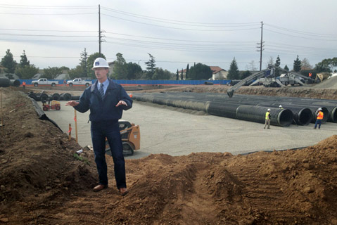 The basin will rest underneath the planned retail area’s parking lot, employing half-a-mile’s worth of five-foot-diameter pipes — dotted with small holes — to collect rainwater for release back into the ground, and during times of major rainfall, to slowly release the H20 into the city’s storm drain system. The project’s developers said the basin will serve dual purposes: conserve water on-site and prevent it from rushing off too quickly during big storms.